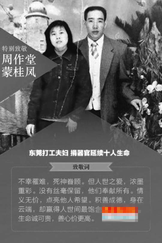 2015年1月23日晚上10点半,周作堂骑着自行车去接妻子蒙桂凤回家,途经东城同沙商业街黄公坑路段时,被一辆21路城巴车撞至昏迷,一直在ICU里抢救。得知抢救无望后,家属希望以捐献器官的形式延续两人的生命,便主动联系省红十会。1月30日夫妻两人抢救无效死亡,于同日接受了器官捐献手术。据广东省红十字会器官捐献协调员说,据其所掌握的信息和媒体的公开报道,夫妻俩双双捐献器官,周作堂夫妇是全国首例。