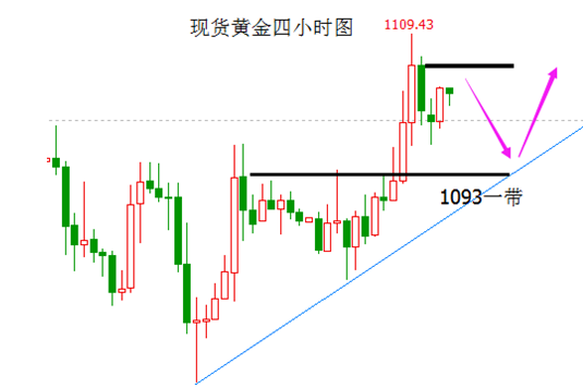 现货黄金昨日连续测试阻力位,而表明看起来弱势的格局,实质是不弱的,本身弱势,但却不跌,连续测试阻力,就会破位,这一点,昨日强调太过于清楚。而今日从日线的角度考虑,现在的走势,是二次测试前期高点1109回落,形成小双顶形态,日线冲高回落,从整体趋势来说,现在还不具备连续大阳的动能,所以,今日应该是小修正行情。但记住,较大幅度上升后,回撤首次,肯定要二次上攻,因此,今日当修正,但可以高抛低吸。早间回撤,而判断今日是否继续强势,主要看欧盘能否二次上升,参考4小时形态,今日应该属于回撤修正。