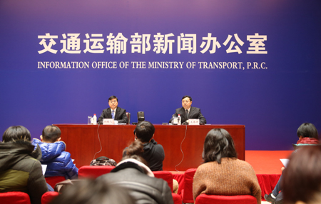 1月21日,交通运输部运输服务司副司长王水平(右)在介绍情况。 邢广利/摄