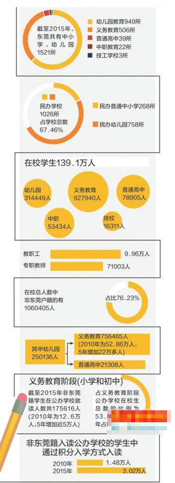 根据东莞市教育局最新统计数据,截止到2015年,东莞共有中小学、幼儿园1521所。其中民办学校1026所,占比67.46%。全市在校学生139.1人万(其中含技工学校1.6万余人),其中非东莞户籍学生1060405人(不包含技校学生),占比76.23%。东莞也是全国随迁子女入学数量最多的地级城市。