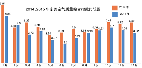 监测数据显示,2015年,东莞空气质量同比明显上升,空气质量综合指数为4.22,与2014年相比下降16.4%(注:空气质量综合指数越低,空气质量越好)。记者统计发现,2015年,东莞除了2月份的空气质量综合指数高于2014年之外,其余11个月均比2014年要低。