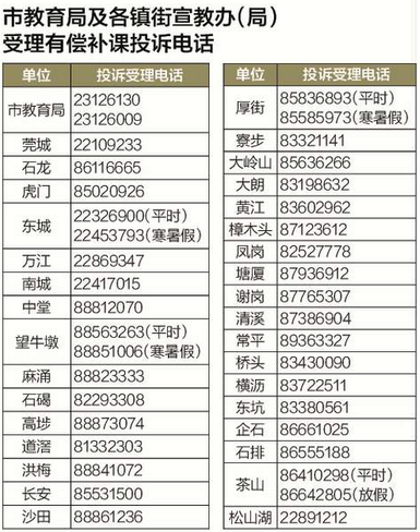 这次,市教育局也向全社会公布了该局和各镇街在职教师有偿补课投诉电话,欢迎广大家长、群众和媒体监督。