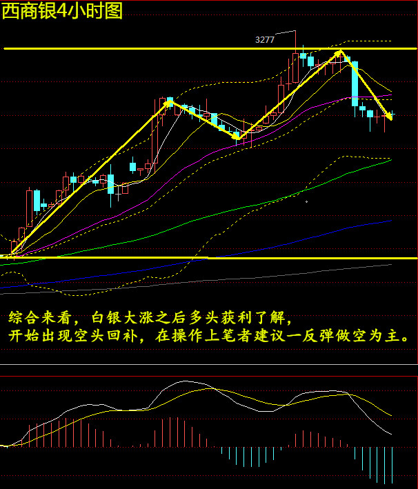 白银昨日早间开盘急跌,延续跌势,这是上周暴涨的一个正常修复,日线收取一根高位十字星之后昨日开盘就开跌,下跌120点,最终收取一根带有下引线的大阴柱,下方依旧触及到日线的十日均线,总体来看上行动能稍显不足,基本回吐了上周的大部分涨幅,目前仍旧无法看到止跌的信号,技术图形上日线级别布林带开口,副图MACD快慢线持平携手前行,红色动能柱缩量,KDJ指标开始向下发散,综合来看短期内回落存在一定力度,空头势必还将继续主导市场,白银正在回到地球,所以在开启新一轮涨势之前,李灏博建议谨慎看空。4小时线上K线跌落至中轨附近。在此处获得支撑,横盘横盘震荡。KDJ指标严重超卖,副图MACD向下发散,绿色动能柱缩量,短期跌势有所减缓,所以在此位置不可继续追空,等到小幅反弹之后才可介入空单。综合来看,白银大涨之后多头获利了解,开始出现空头回补,在操作上李灏博建议一反弹做空为主。