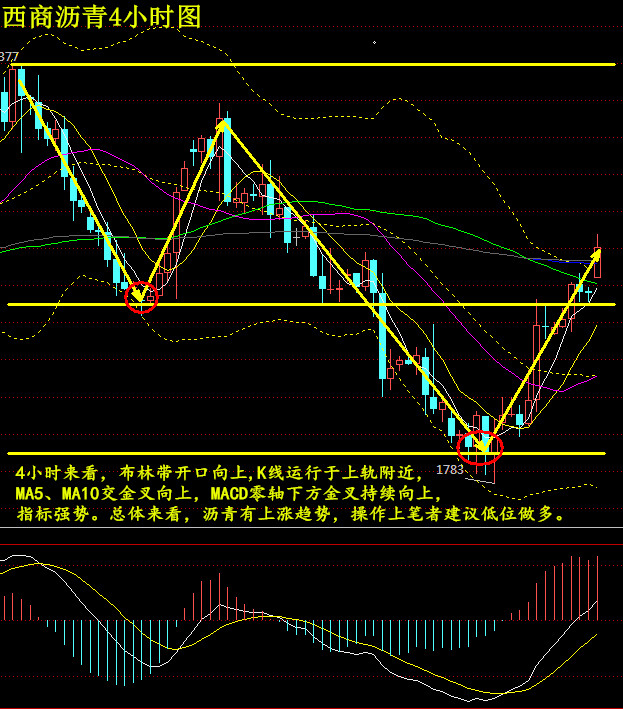 沥青日线上看,K线运行于布林带中轨附近,布林带开口持续向下,MA5和MA10死叉向下勾头向上,MACD零轴下方交死叉开始勾头向上,指标弱势;4小时来看,布林带开口向上,K线运行于上轨附近,MA5、MA10交金叉向上,MACD零轴下方金叉持续向上,指标强势。总体来看,沥青有上涨趋势,操作上李灏博建议低位做多。