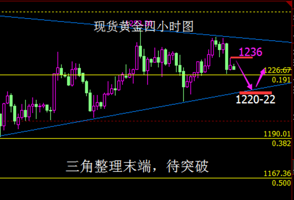 现货黄金早间可参考策略:黄金现价1231-32短空,损36,目标看1225-22一带破位持有;