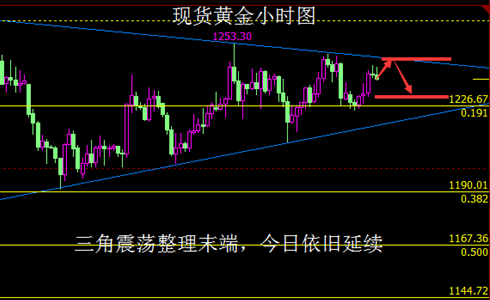 现货黄金日线还是没有转折,而是反复高位盘整,继续洗盘,老话重提,中线空单布局到你不想碰的时候,行情就掉头了。都感觉空累了,自然就到顶了。这几日,都在不断尝试空头中线,但行情遛个弯就上来了,这就是洗盘。日线阴阳转还,今日关注两个位置,两个时间点,日内回测还可以短多,下方位置关注昨日凌晨修正低点和大阳线低点,1231.5-34区间。破27损,上方继续看1238-40,1245一线。美盘,上方关注三角形顶轨,触及依然可以做空,日线阴阳线,并非是突破格局,上方阻力1246附近。日线高位震荡,预计今日继续走整理形态。