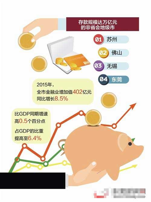 据了解,2015年,全市金融业增加值达402亿元,同比增长8.5%,比GDP同期增速高0.5个百分点,占GDP的比重提高至6.4%,成为增速较快的行业之一。我市更成为继苏州、佛山、无锡之后全国第4个存款规模达到万亿元的非省会地级市。全市新增上市企业3家,境内外上市企业达32家,上市后备企业达114家。
