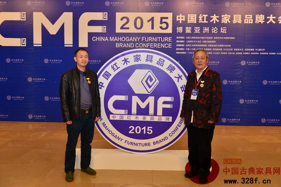 清艺居红木董事长李裕青受邀参加第六届中国红木家具品牌大会,并与古典家具传承工艺大师王秀林合影