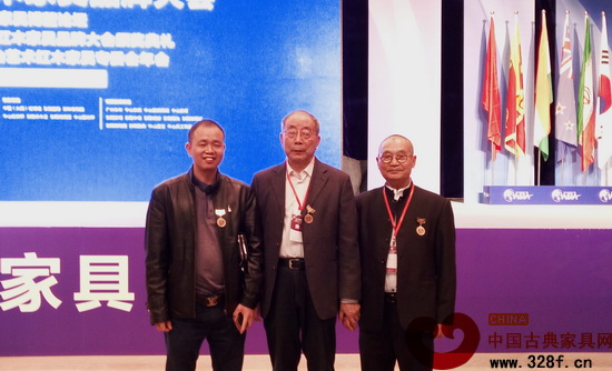 清艺居红木董事长李裕青受邀参加第六届红木家具品牌大会,并与中南林业科技大学博士生导师胡景初(右一)和中国红木家具技术专家曹新民(中)合影