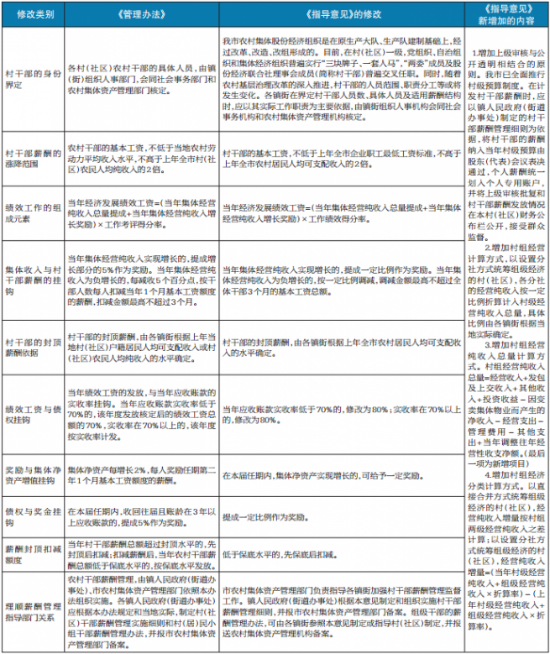 “村干部薪酬敏感度高、涉及面广,东莞市农业部门开展《管理办法》实施情况专题调研,形成了修订稿,并先后两次征求镇街和市相关部门意见”。市农资办介绍,《东莞市村(社区)“两委”成员及股份经济联合社理事会成员薪酬管理指导意见》对2011年的《管理办法》修改,集中体现为“两调整、两明确”。“两调整”,是指调整完善市镇管理权责,赋予镇街更大管理权限;调整完善部分控制指标,对集体债权追收等提出更高要求。“两明确”,是指明确村干部的界定原则,以适应农村基层治理改革深入推进的需要;明确集体经济统筹改革后的计酬办法,引导加强对组级经济的统筹统管。