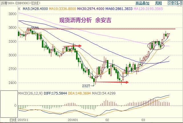 沥青价格受库欣原油库存减少,市场供应过剩的局面将会缓解利好影响,价格强势上行再次试探上方阻力位,短期内上方需留意价格是否企稳3500一线,下方支撑位上移至3300及3200附近,整体以偏强趋势看待,操作上余安吉建议以低位做多为主,参考点位3380附近多单,止损3350下,目标3480-3500。