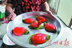 殷秀梅介绍说,“红团”寓意鸿运当头,大吉大利,是当地人祭祖必不可少的食品,这是世代相传的传统习俗。在以前,每逢清明、重阳临近,家家户户都会自做“红团”祭祖。但随着时代发展,亲手做“红团”的市民已经不多了,大多直接订购,图个方便。(记者 谢英君 董哲)(来源:广州日报)