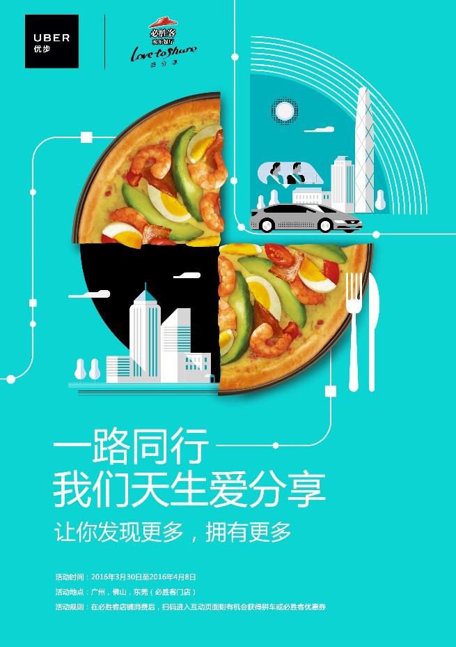 必胜客进驻中国20余年,一直向消费者传递着休闲欢乐的理念,深得消费者的喜爱。必胜客每年都会推出春秋两季新菜单,而这次春季新菜单的推广以“分享”为主题,鼓励人们在分享美食同时,也把快乐分享出去。虽然Uber进驻中国不久,但凭借出色的落地营销活动以及良好的服务体验,逐渐累积忠实用户。