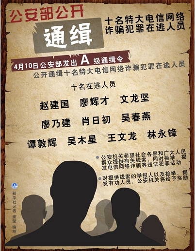 2016年4月10日,公安部发出A级通缉令,公开通缉十名特大电信网络诈骗犯罪在逃人员。这十名在逃人员是:赵建国、廖辉才、文龙坚、廖乃建、肖日初、吴春燕、谭敦辉、吴木星、王文龙、林永锋。