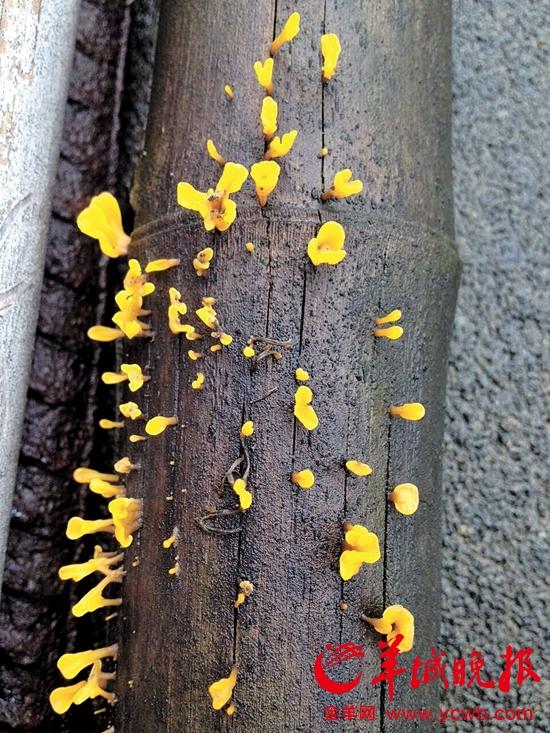 方小姐告诉记者,这根竹竿放在阳台上有五六年了,主要用来晒衣服用。“以前,这根竹竿还长过黑木耳的,今年是第一次看它长出‘小黄花’。”方小姐说,她是在当天早上晒衣服的时候发现这些“小黄花”的,她猜测,雨水天气让隐藏在竹竿内的菌类萌芽了。“你看,这些‘小黄花’都是从竹竿的小裂缝里钻出来的,我估计平时会有不少菌类藏在竹竿里,最近天气合适,又加上雨水充足,所以它们都长出来了。”