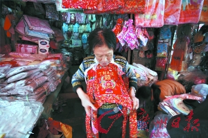 黄伯的妻子向记者展示了一款旧式的绣着吉祥花纹图案的婴儿背带:这是“旧阵时”虎门独有的背带,现在虽然自己的店里也卖新式的婴儿背带,但来帮衬的老人家认为,还是这种背带背婴儿最舒服。(记者 刘满元)(来源:广州日报)