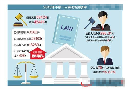 将近30万宗案件,是什么概念呢?第一人民法院院长陈斯告诉记者,该院连续七年每年完成超4万件审判执行任务;2015年,受理各类案件更是创历史新高,达到53424件,与上年同期相比上升19.55%,结案45441件,与上年同期相比增长13.99%,法官人均办案286.31件,比上年增长26.24%。