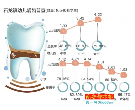 在对石龙镇19间幼儿园和6间小学的16540名学生进行口腔健康普查后发现,石龙镇患龋率普遍较高,超出预想状况。
