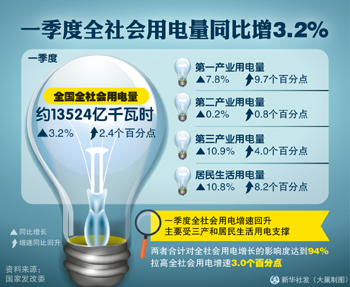 国家发展改革委新闻发言人赵辰昕表示,一季度全社会用电增速回升主要受三产和居民生活用电支撑,第三产业和居民生活用电量同比分别增长10.9%和10.8%,两者合计对全社会用电增长的影响度达到94%,拉高全社会用电增速3.0个百分点。