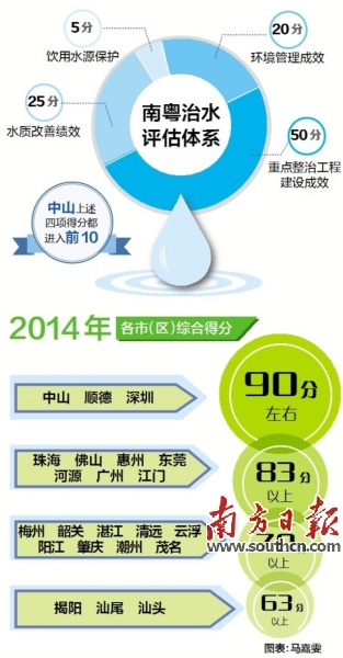 对此,相关专家解释,评估指标体系除了包含水质改善绩效(占25分)外,还包括重点整治工程建设成效(占50分)、环境管理成效(占20分)、饮用水源保护(占5分)共四大类内容。评估采取了自查自评、现场核查、量化评估、意见反馈、总结提升等技术方法。其中,综合得分排首位的中山上述四项得分都进入前十。