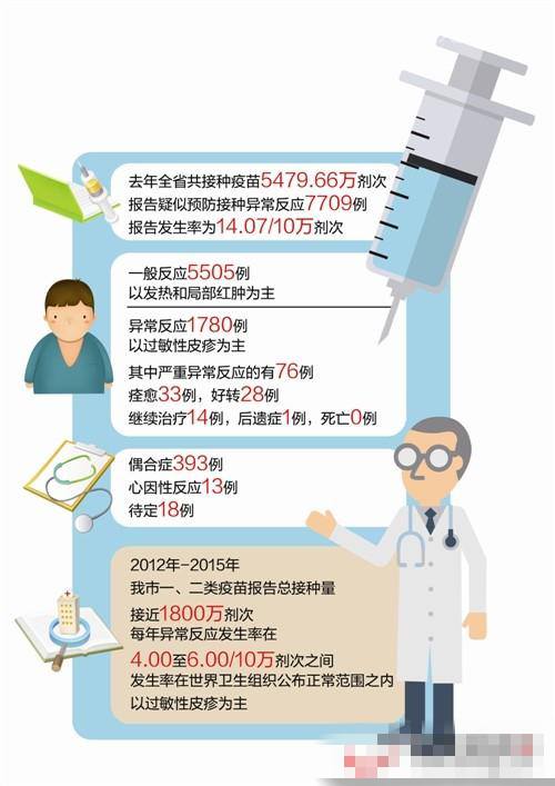 昨日是“全国预防接种宣传日”。省卫计委通报称,2015年,全省共报告疑似预防接种异常反应7709例,大多为发热、局部红肿、过敏性皮疹。暂未发现因疫苗质量问题导致的事故。