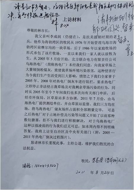 老人看在眼里急在心上,毕竟这是他一手经营起来的草场。这块草场洒满了他的汗水、也浸润着他的心血,眼睁睁地看着草场被赤裸裸地破坏,他于心何忍!于是,屡屡向该公司及各有关部门反映情况,然而收到的却只是一再的拖延与搪塞。自2005年老人开始维权算起,直至今日已经十余年过去了,依然没有一个明确的结果。更令人气愤的是地方政府甚至连老人之前的承包权益都不予“确认”了——如今当地相关部门不予老人承包的草场重新确权和及时换发新版《草牧场使用证》。而电厂的粉煤灰等垃圾倾倒也从没有真正停止过!请问这与赤裸裸的“掠夺”有什么不同?政府机关原本应是牧民们最应信赖的部门,然而怎可如此“出尔反尔”?乌海热电厂到底有什么来头,能让地方有关部门违背公理和责任,去进行如此的“袒护”?即便牧民的个人权益是可以“随意”侵害的,那么难道这千里牧场的自然环境也是可以随意践踏吗?华北地区的沙尘暴向来严重,国家一直在“三令五申”,要保护生态环境,然而地方政府就可以这样的“熟视无睹”和“无所作为”吗?