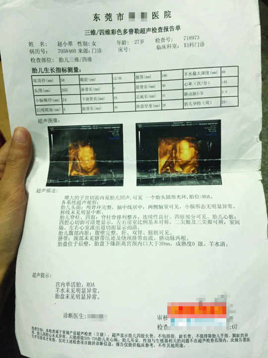 2013年5月19日,这是赵小翠在临产前,最后一次在厚街医院进行B超检查,检查显示宫内单活胎,胎盘成熟度II级。想到自己马上就要生产了,当年5月26日,她又前往市区的康华医院进行了一次B超检查,不过,这次检查结果犹如晴天霹雳。