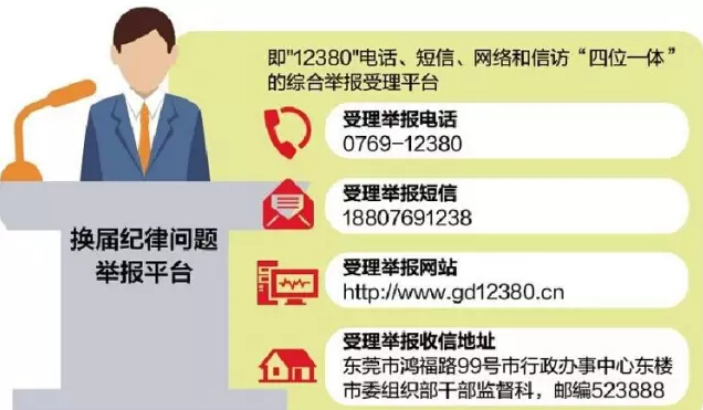 为深入贯彻全面从严治党要求,从严从实做好全市镇街领导班子换届风气监督工作,日前,市纪委、市委组织部联合印发了《关于加强换届风气监督的实施方案》(以下简称《实施方案》),对加强换届纪律教育和换届风气监督工作提出了明确要求。 根据《实施方案》,东莞明确了五类责任主体,将以“零容忍”的态度正风肃纪,15个工作日内完成举报查核,对重点案例点名道姓曝光。