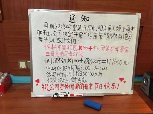 喝饮料中88800元母亲节红包 奇葩加班狗兴奋晕倒