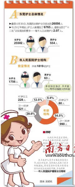 今天是护士节,根据东莞市卫生计生局统计,截至4月30日,东莞的注册护士已经达到26056人,其中男护士有554人。与2012年相比,护士人数增加了6765人,提前达到了“十二五”卫生规划的要求——每千人口注册护士2.07人。