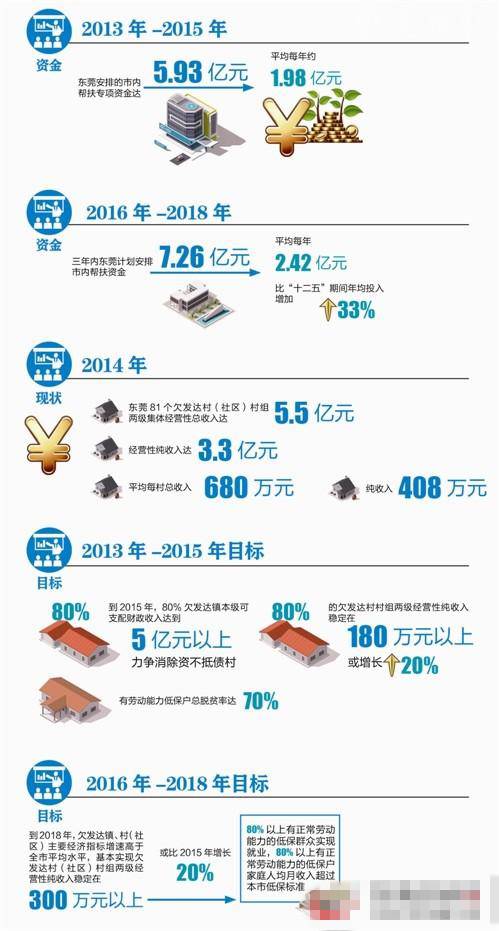日前,东莞市委、市政府出台了《关于进一步推进市内帮扶工作的意见》(以下简称《意见》),确定2016年-2018年市内帮扶目标和措施。《意见》指出, 2016年-2018年,东莞市将安排市内帮扶专项资金7.26亿元,用于帮助欠发达村(社区)发展创收项目、完善基础设施建设和促进困难群众就业,平均每年2.42亿元,比“十二五”期间年均投入增加33%。