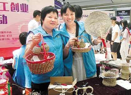 在沙田镇虎门港的摊位上,用莞草编制的手工竹篮、花瓶格外受欢迎,定价均在20-50元之间,而社区妈妈们完成一个竹篮,最快只要半小时。据社工介绍,沙田虎门港和安村“妇女之家”展示的“莞草编织”项目,通过组织困境家庭妇女学习制作莞草编织手工艺品,然后寄卖,使这些妇女生计改善的同时也保护和再生了非物质文化遗产“莞草编织”的传统技艺。