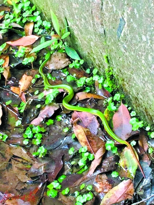 不仅王女士一家有此遭遇,在长安镇一模具企业工作的岑先生也致电记者说,5月15日那天,他一家四口趁着周末出去玩,行至大岭山森林公园大板绿道的一个亭台附近时,也遇上了一条全身青绿色、体侧有黄色纵线且尾巴有点焦红的蛇。