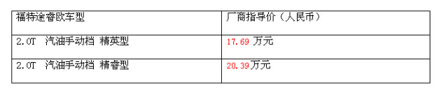 福特途睿欧共有2款车型,厂商指导价为17.69万元-20.39万元人民币,提供珠光白、极光银、玄武灰、香槟金、流光棕、银沙黑六种车身颜色,具体售价如下: