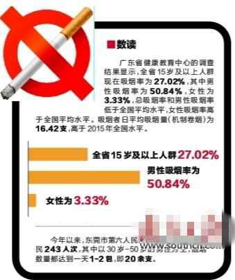 今年世界无烟日来临之前,广东省健康教育中心公布了一项调查,全省15岁及以上人群现在吸烟率为27.02%,其中男性吸烟率为50.84%,女性为3.33%,总吸烟率和男性吸烟率低于全国平均水平,女性吸烟率高于全国平均水平。每日吸烟者日平均吸烟量(机制卷烟)为16.42支,高于2015年全国水平。