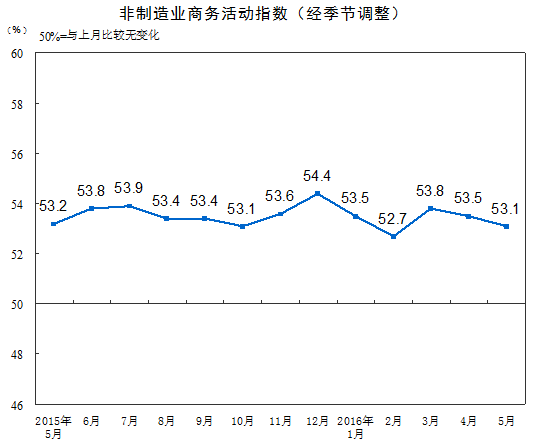 2016年5月份,中国非制造业商务活动指数为53.1%,比上月小幅回落0.4个百分点,与去年同期基本持平,非制造业继续保持稳定增长态势。