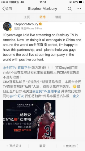 6月8日,马布里个人微博发布消息称其已入驻全民TV,成为新晋主播,据了解马布里将在全民TV常驻进行直播。
