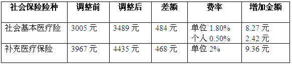 市社保局表示,下月起社会基本医疗保险缴费基数从3005元提高到3489元,基本医疗保险得多缴11.132元,其中单位多缴8.712元,个人多缴2.42元;补充医疗保险缴费基数由3967元提高到4435元,补充险多缴9.36元,由单位全部承担,个人不用缴费。