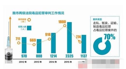 分析报告指出,从近5年来看,毒品犯罪案件数量不断上升。2012年、2013年、2014年、2015年、2016年至今分别为711件、669件、918件、1800件、774件。可以看出2015年毒品犯罪案件急剧上升。同时,犯罪人数逐年增加。2012年、2013年、2014年、2015年、2016年至今分别为970人、888人、1214人、2325人、1137人。与2014年相比,2015年涉毒品犯罪人数已增长近一倍。三是涉案类型较为集中。从两级法院毒品案件涉案类型来看,主要的毒品案件类型为走私、贩卖、运输、制造毒品犯罪与非法持有毒品犯罪。其中走私、贩卖、运输、制造毒品犯罪占毒品犯罪案件的70%以上。此外,窝藏、转移、隐藏毒品、毒赃罪,非法买卖制毒物品罪及容留他人吸毒罪等犯罪类型也时有发生。