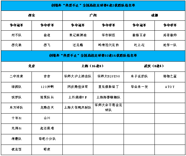 以下为目前创维杯“热爱不止”全国高校足球赛的晋级队伍名单: