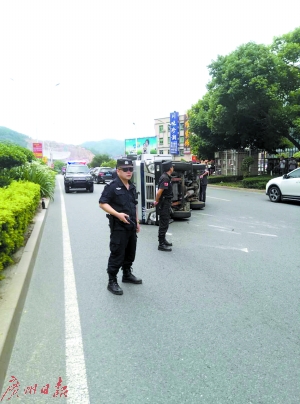 当天上午8时许,樟木头机动巡逻大队的民警驾车巡逻途经樟木头西城路香樟1号花园小区门前路段时,发现前面有一辆运钞车侧翻在路基旁边,几名押钞员正不知所措地站在运钞车旁边。