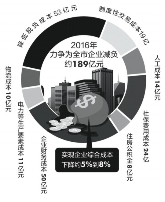 会议要求,要突出抓好两个《实施方案》的推进,解决制约外资和民营企业发展的瓶颈问题。今年,要力争为全市企业减负约189亿元,包括:降低税负成本53亿元、制度性交易成本19亿元、人工成本14亿元、社保费用成本24亿、住房公积金8亿元、企业财务成本50亿元、电力等生产要素成本11亿元、物流成本10亿元等,实现企业综合成本下降约5%到8%。