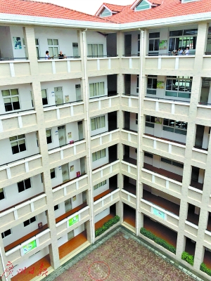 记者在现场看见,李某是从教学楼连廊中间的栏杆处摔下,事发的栏杆高度为1.28米。