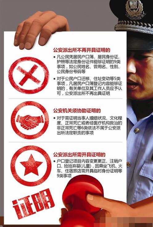 意见(征求意见稿)明确了有关单位要求群众开具证明或者提供证明材料要遵循于法有据和“谁主管、谁负责”的原则,并列出了公安派出所不再开具证明的20类事项和应当或者可以开具证明的9类事项,具体分为四大类情形:一是凡公民凭居民户口簿、居民身份证、护照等法定身份证件能够证明的9类事项,如公民姓名、曾用名、性别、公民身份号码等,有关单位及其工作人员应予认可,公安派出所不再出具证明;二是对于公民户口迁移、住址变动等5类事项,凡居民户口簿登记内容能够证明的,有关单位及其工作人员应予认可,公安派出所不再出具证明;三是对于需证明当事人婚姻状况、文化程度、正常死亡或者经医疗机构救治的非正常死亡等6类依法不属于公安派出所法定职责的事项,根据情形分别由主管部门出具证明、使用部门核查,或者依法办理公证,对涉及公安机关职责的事项,公安机关给予必要协助;四是公民在办理相关社会事务时,无法用法定身份证件证明,需要公安派出所开具相关证明的9类事项,如户口登记项目内容变更更正、注销户口、捡拾弃婴(儿童),因乘坐飞机、火车、住宿旅店需开具临时身份证明等,由公安派出所根据具体情况予以办理。