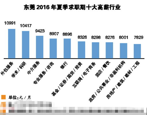 知名招聘公司在线数据显示,东莞地区2016年夏季求职期,外包服务的平均月薪最高,为10991元;其次为学术/科研,薪酬水平为10417元;再次是中介服务行业,平均月薪为9423元。