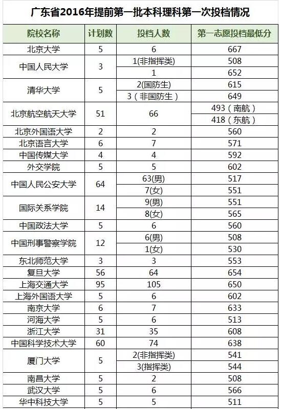 广东省2016年提前第一批本科理科第一次投档情况