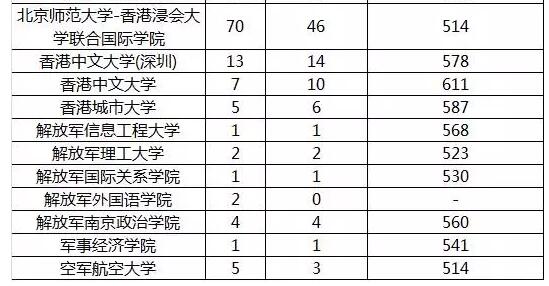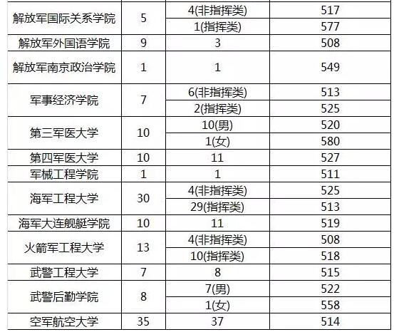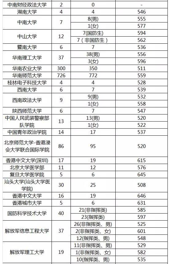 今年,招收国防生的部队院校和普通高校绝大部分都能在第一志愿完成招生计划,其中省外的清华大学、武汉大学、厦门大学、中南大学等,省内的中山大学、华南理工大学等,投档分都远超一本线。部队院校文理科仅解放军外国语学院第一志愿未满档。