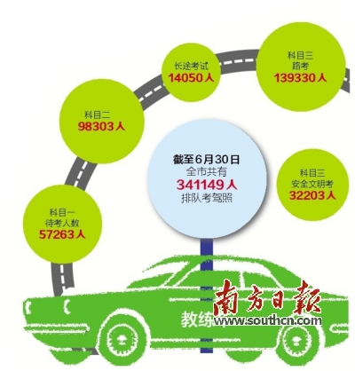 东莞市交通运输局公布的一项数据显示,截至6月30日,全市共有341149人排队考驾照,其中,科目一待考人数为57263人,科目二为98303人,长途考试为14050人,科目三路考为139330人,科目三安全文明考为32203人。
