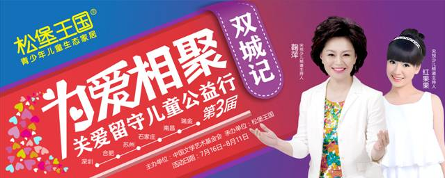 7月16日起至7月31日,“为爱相聚•双城记”——松堡王国第三届关爱留守儿童公益行将在深圳、合肥、南昌、苏州、石家庄进行为期半个月的爱心天使招募选拔,选出来的家庭由松堡王国全程承担行程费用,同中国文学艺术基金会、明星组成爱心天使团前往江西瑞金慰问留守儿童,并进行三天四夜的寻爱之旅,此次活动旨在呼吁更多社会人士关注留守儿童,让城市孩子乡村寻根,留守儿童城市寻亲,个人的力量微不足道,企业的力量也是有限的,我们期待您的参与!