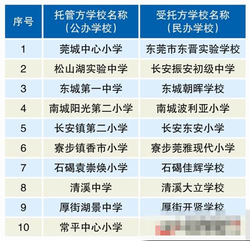 东莞义务教育民办学校委托管理试点学校名单公布 2016-07-14 09:53:49 莞讯网 东莞义务教育民办学校委托管理试点学校名单公布 紧接上月底实行东莞中学托管南城中学“公托公”试点,日前市教育局公布了《东莞市义务教育民办学校委托管理试点学校名单》,来自寮步、厚街、常平等镇街的10所民办学校下半年起将由10所公办学校展开一对一的托管试点工作。未来3年,市教育局将每年向每所托管方学校下拨80万元专项资金,用于支持“公托民”的试点工作开展。(来源:东莞时报) 上一篇:东莞理工学院省内一本招生第一志愿基本录满 下一篇:东莞普高招生补录分数均在最低控制线附近 返回首页